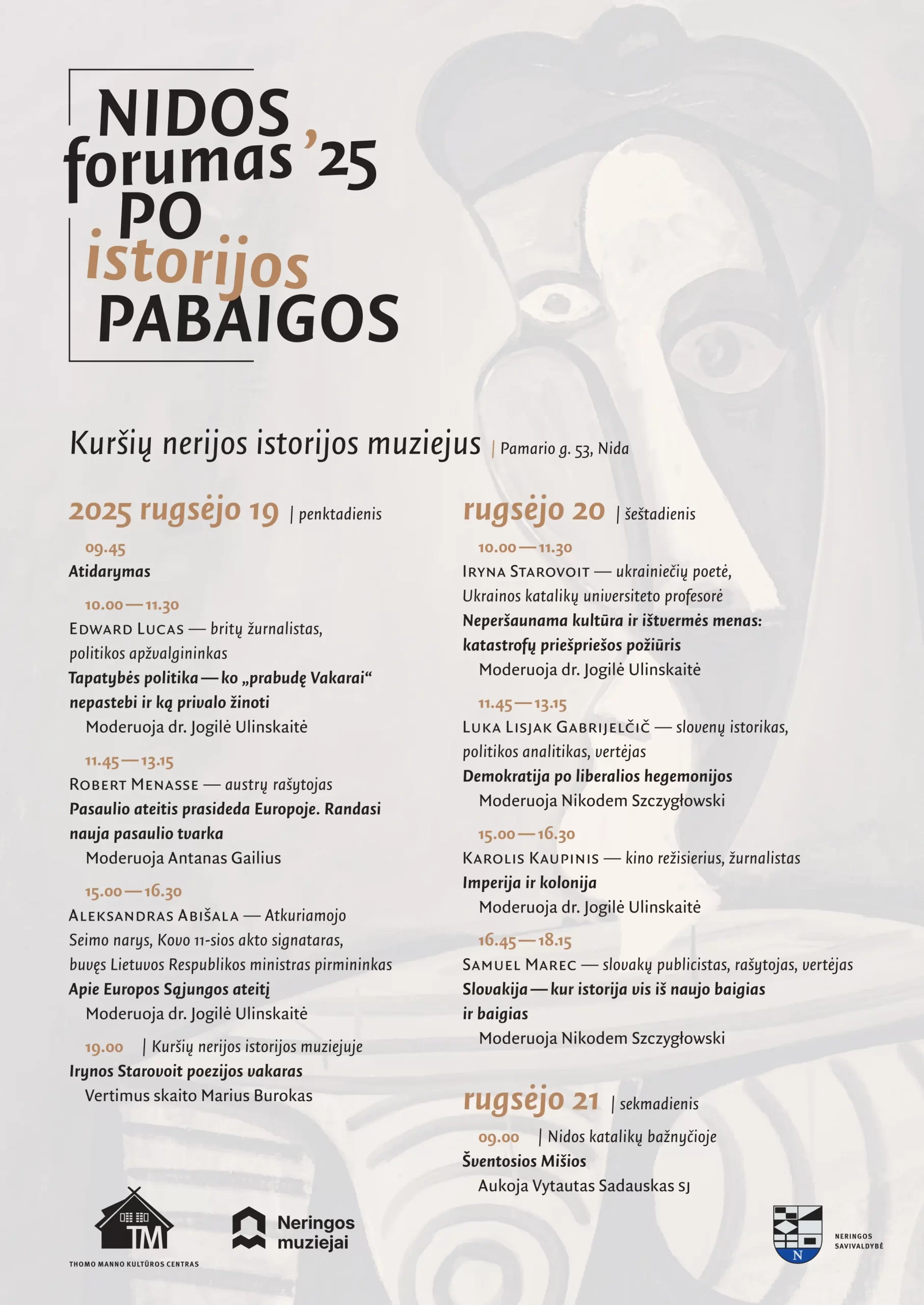 Kviečiame į VIII tarptautinį Nidos forumą „Po istorijos pabaigos“, kuris vyks 2025 m. rugsėjo 19–20 d. Kuršių nerijos istorijos muziejuje (Pamario g. 53, Nida).
